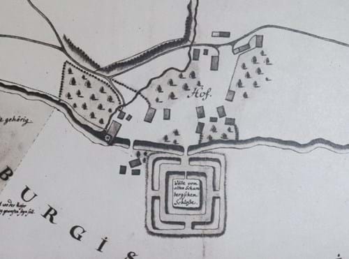 Ortschronist Friedrich Bürger weiß dazu folgendes zu berichten: Tatsächlich gab es auf dem Areal des ehemaligen Schaumbergischen Rittergutes zu Hof neben ein paar Höfen, einer Mühle und einem Wirtshaus noch eine besondere Anlage, vermutlich die besagte Niederungsburg. Selbst heute könne man mit einem Luftbild den Standort und die quadratischen Umrisse einwandfrei lokalisieren. Auch die genaue Größe des Grundrisses lässt sich mit Hilfe des Bayernatlas (Geoatlas Bayern, historische Karte von Hof aus dem Jahr 1860) ganz genau bestimmen.