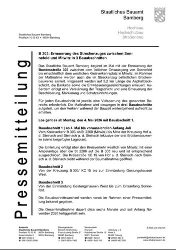 B 303: Erneuerung des Streckenzuges zwischen Sonnefeld und Mitwitz in 3 Bauabschnitten