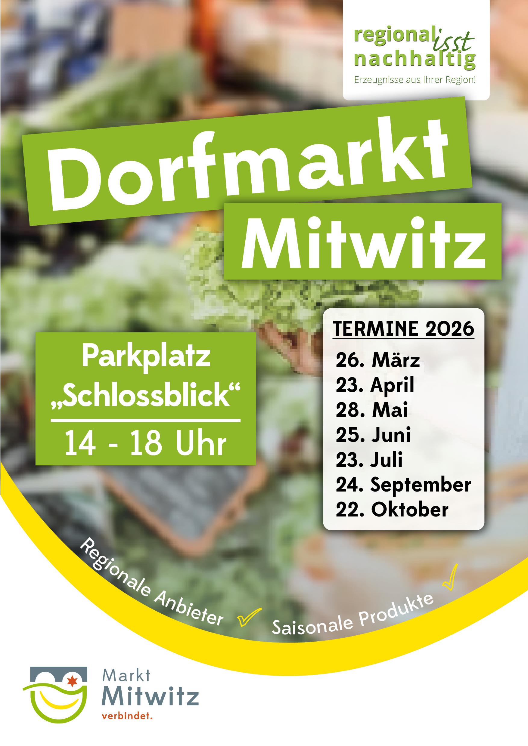 Der Mitwitzer Dorfmarkt beginnt die neue Marktsaison – und das an einem neuen Standort. Ab sofort findet der Markt auf dem Parkplatz Schlossblick, direkt gegenüber der Turnhalle, statt. Den Auftakt bildet der Donnerstag, 26. März 2026, von 14:00 bis 18:00 Uhr. Künftig lädt der Dorfmarkt regelmäßig jeden vierten Donnerstag im Monat an diesem Standort zum Treffen, Einkaufen und Verweilen ein.