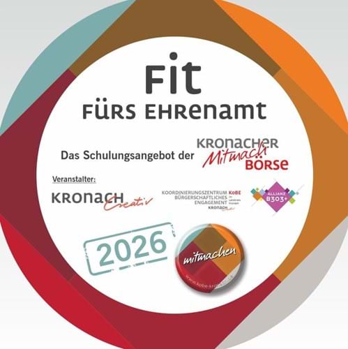 Wir freuen uns auf euch – unsere Vereinsseminare finden aktuell rein online statt. Weitere Termine und das Anmeldeformular finden Sie online unter https://kronachcreativ.de/fit-fuers-ehrenamt-das-schulungsangebot-der-kronacher-mitmachboerse-2026/