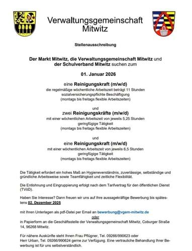 Der Markt Mitwitz, die Verwaltungsgemeinschaft Mitwitz und der Schulverband Mitwitz suchen zum 1. Januar 2026