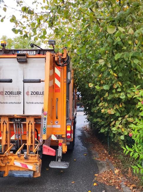 Immer wieder kommt es vor, dass Hecken oder Büsche über die Grundstücksgrenze in den Straßenraum hineinwachsen und somit die Durchfahrt der Müllfahrzeuge erschweren oder gar unmöglich machen. Überhängende Äste können zu Beschädigungen an An- und Aufbauten und Hydraulikleitungen der Müllfahrzeuge führen, da ein Ausweichen aufgrund der zu geringen Straßenbreite, trotz eingeklappter Spiegel, nicht möglich ist.